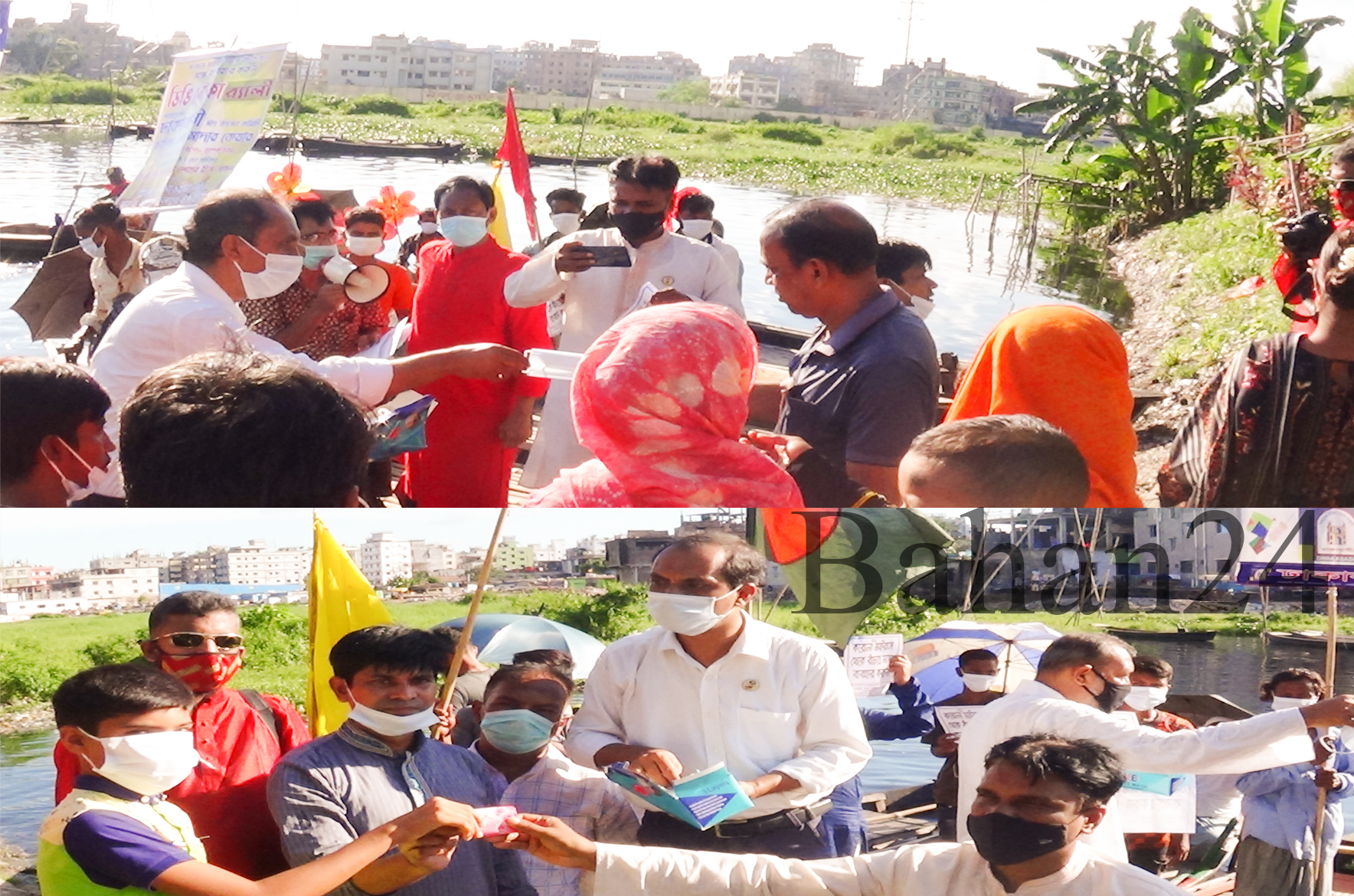 জনসাধারণের মাঝে ফ্রি মাস্ক বিতরণ ও ডিঙ্গি নৌকা প্রতিকী র‌্যালি ঢাকাবাসী সংগঠন।